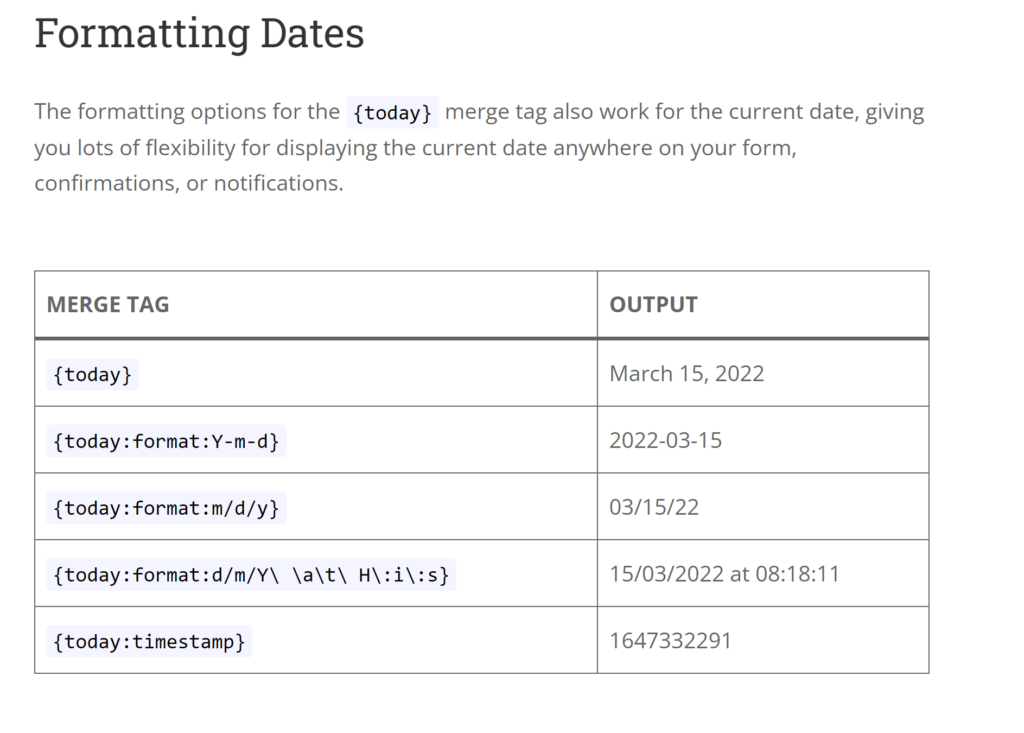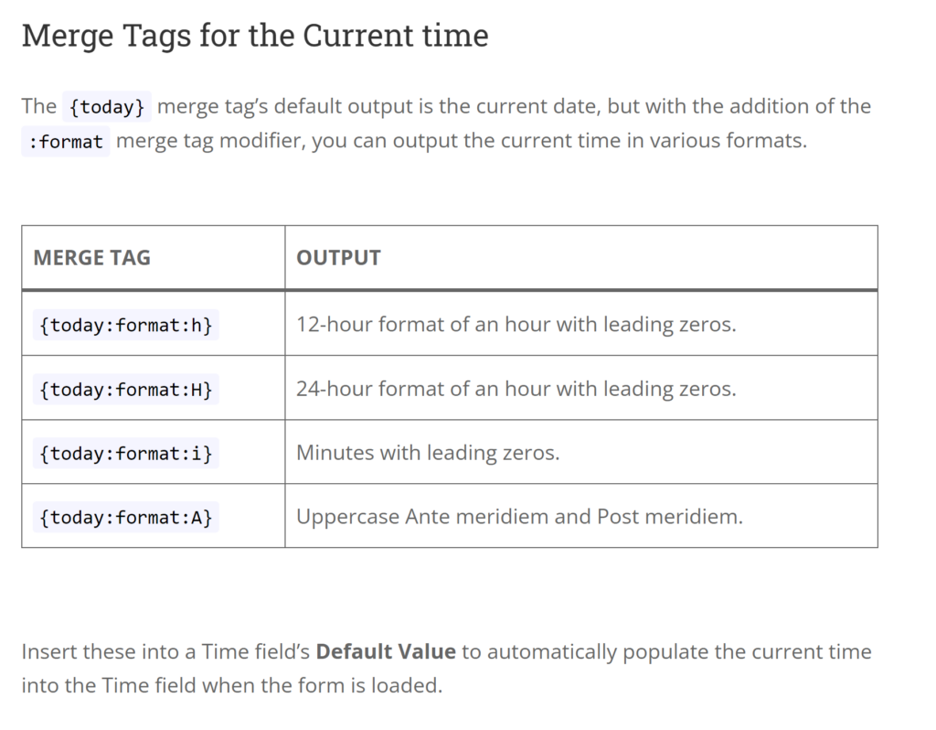 The {today} merge tag’s default output is the current date, but with the addition of the :format merge tag modifier, you can output the current time in various formats.